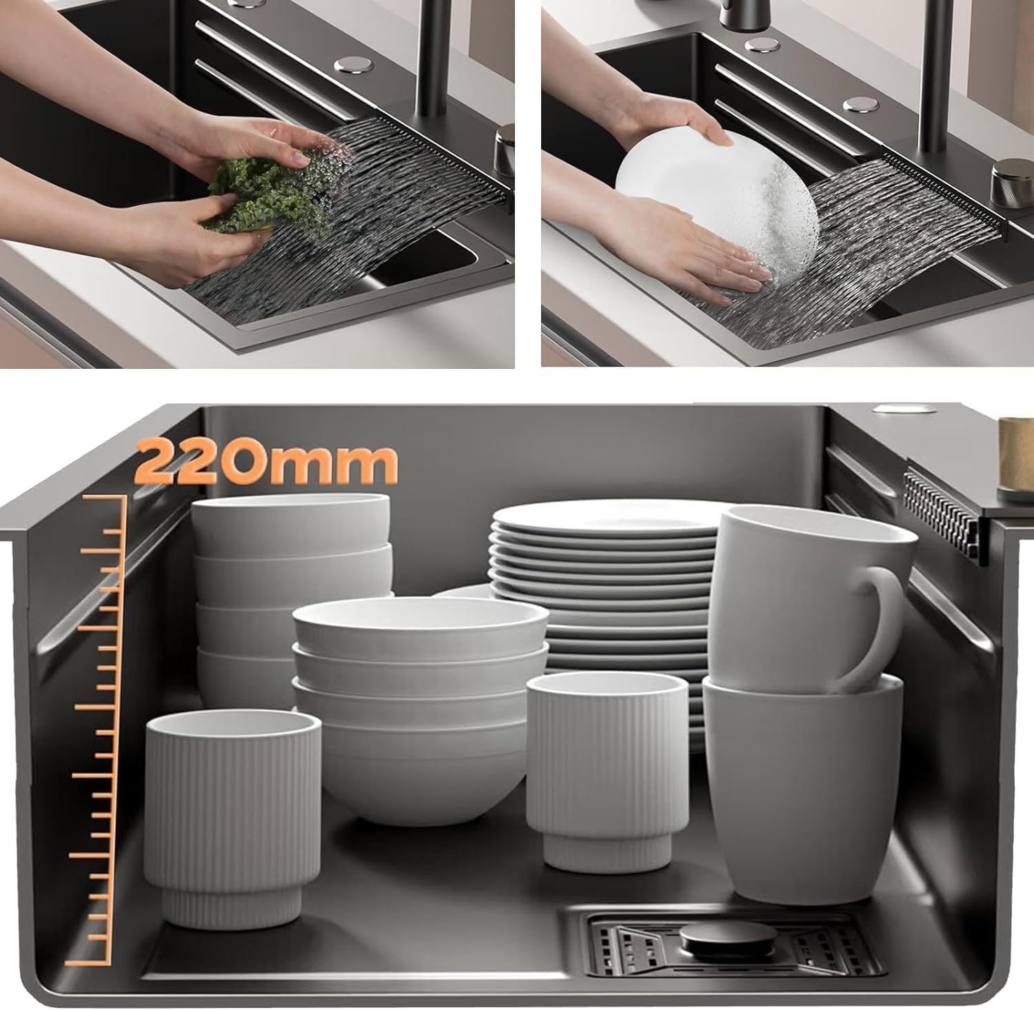 - Unique Waterfall Faucet Design : Waterfall spout makes this sink really pretty and the large area of flowing water make it easy and effective when washing foods and tableware. will offer you an extremely pleasure experience.