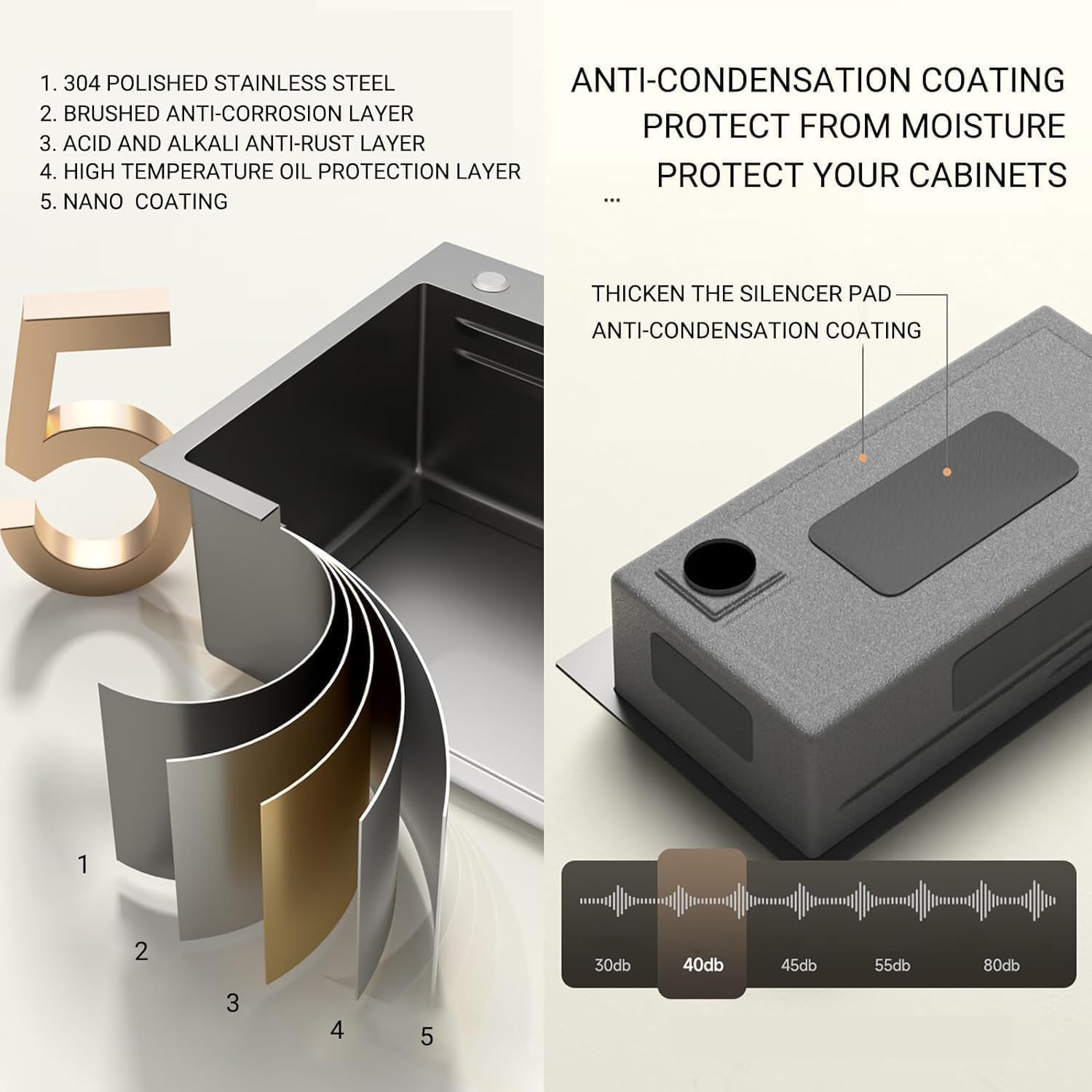- Durable Material : This sink is made with premium 304 Grade Stainless steel, with excellent strength and durability, rust and dent resistance. The matte NANO coating surface will not have water stains, wipe clean for easy maintenance.