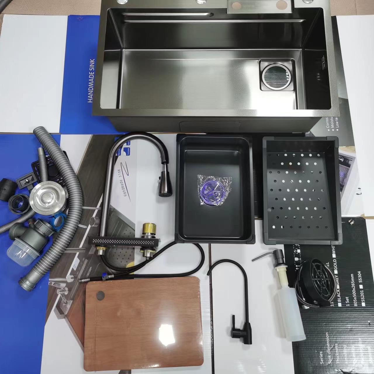 - Box Includes : Kitchen Sink + Two Stainless Steel Baskets + One Wooden Chopping Board + One Attached Waterfall And Pull Out Faucet + One Abs Soap Dispenser + RO TAP + One Cup Washer + Drain Coupling + Drain Waste Pipe + Faucet Connection Pipe