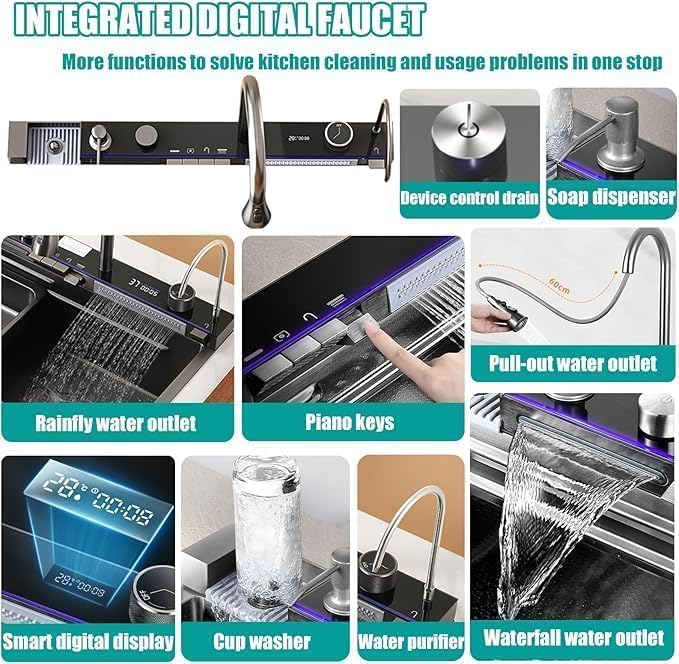 - Integrated Accessories: 1 x One-piece Integrated Faucet,1 x Ebony Cutting Board, 1 x Stainless Steel Colander, 1 x Stainless Steel Mini Washing Sink, 1 x Large Square Drain Assembly with Cover,1 x Drain Pipe, 1 x Faucet Tap Connection Pipe, 1 x Waste Coupling, 1 x Soap Dispenser, 1x Water Purifier Tap